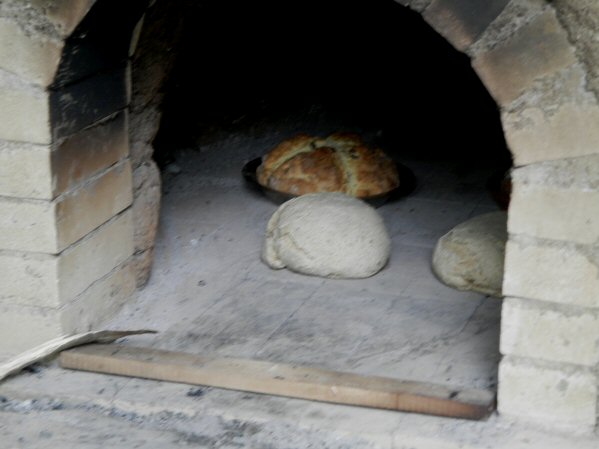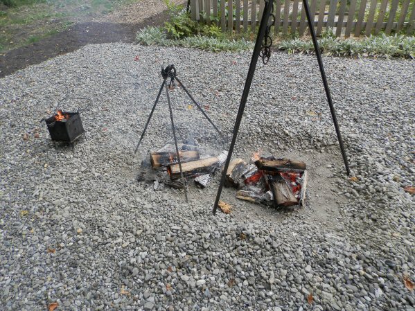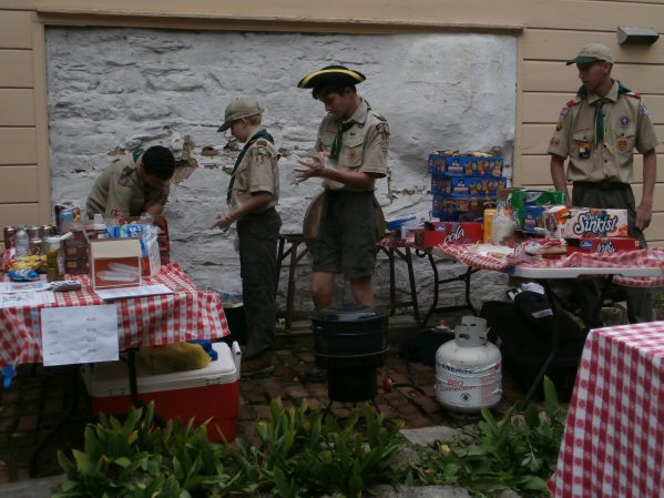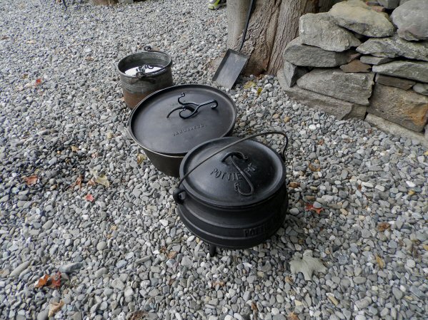 (Above L-R) Apple pie is prepared for baking in the NEW Colonial Clay Oven. Jim Burr Sr., Judy Wolf, Tracy Wolf & Jim Burr Jr. pose in front of the oven while fresh bread bakes. Getting hungry yet? (Below L-R) Firewood is burned down to hot embers to heat the Colonial Clay Oven. The Boy Scouts of Troop 65 prepare refreshments donated by Price Chopper. Assorted cast iron cookware used to make stews and other colonial dishes. (click any image to view the full-size version) |