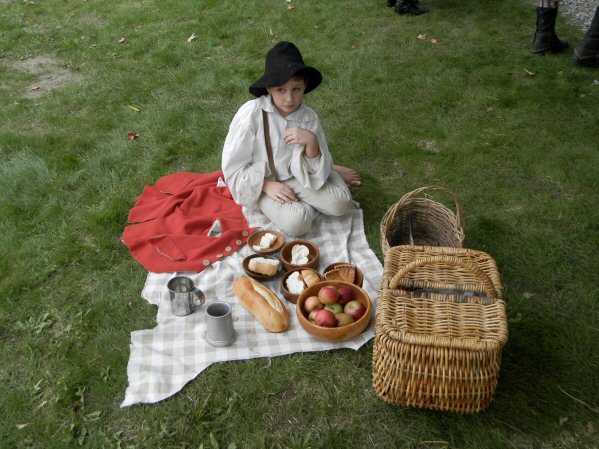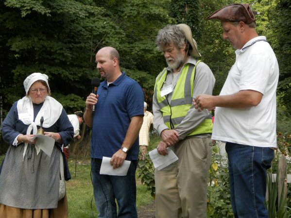 (Above L-R) People gather at the D.A.R. monument for a interpretive walk to the burial ground. Nicole Smith portrays Sybil Ludington with Beatrice (the horse) and Hugh Francis as British General Clinton. Troops muster for inspection.(Below L-R) Young patriot Andy poses with members of Garden State Black Powder. Daniel Velardo enjoys a colonial era picnic on his special day - Happy Birthday, Daniel! FOFSD Secretary Judy Wolf, President Lance Ashworth, Trustee Bill Sandy and Trustee Rob Ashworth read the names of the 85 soldiers known to have "died at Fishkill." |